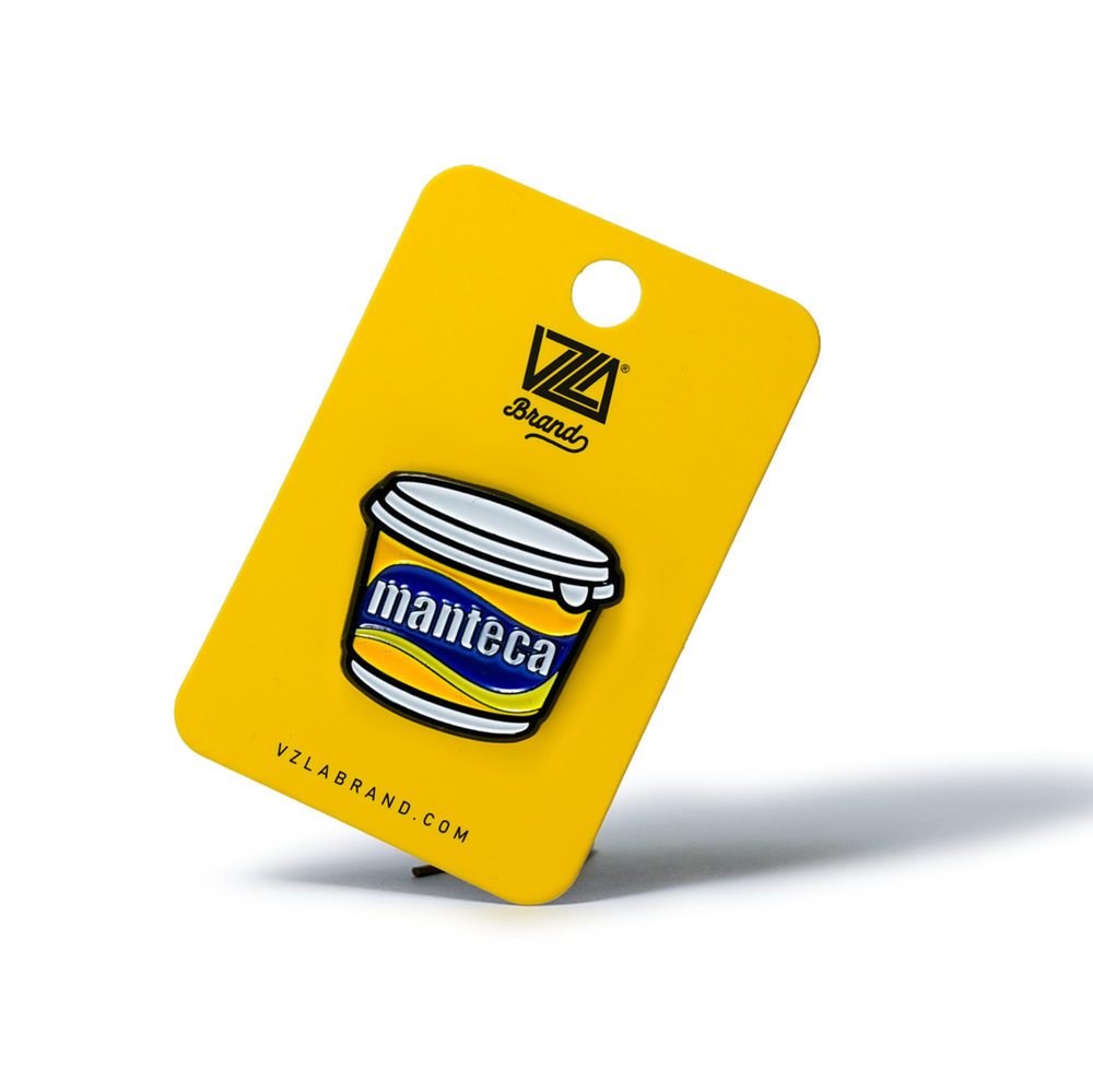 A playful enamel pin inspired by the classic manteca tub found in every Venezuelan kitchen. A little piece of culinary nostalgia that brings sabor criollo to your style.