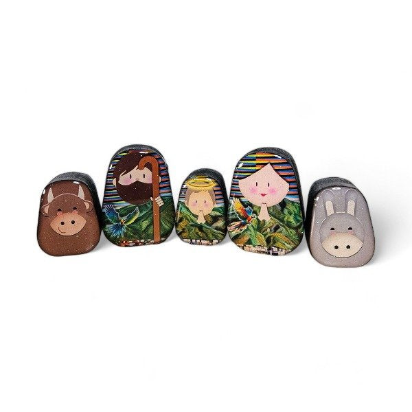 Las 5 piezas de José, María, el Niño Jesús, la mula y el buey podrías elegir si deseas una caja de madera con una imagen de fondo ó una figura del Ávila ó hecha con MDF y resina.